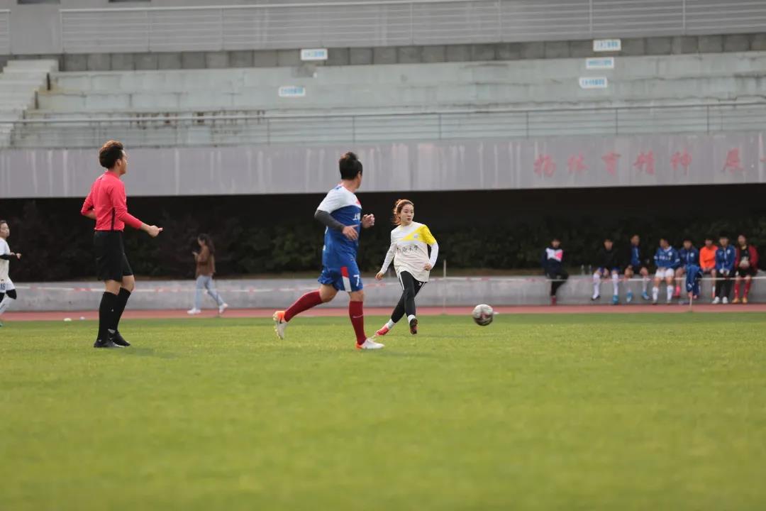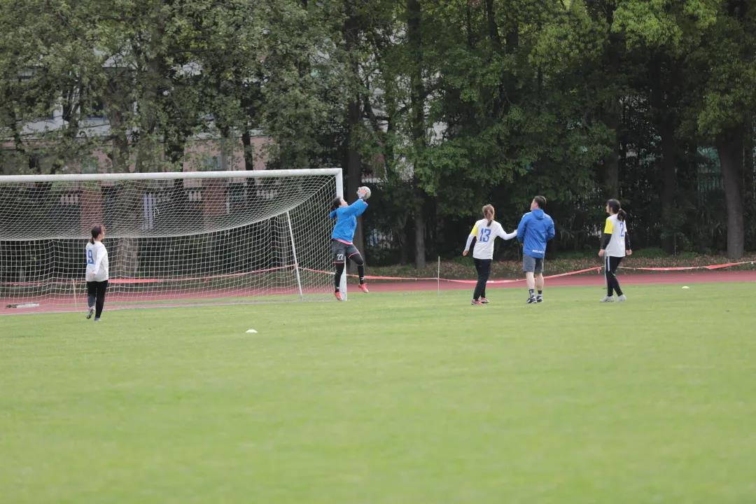 男方后场的曲圣卿老师和季斌老师也多次拦截横穿并迅速向前场推进。第38分钟,女足中锋曹嘉仪同学接到后场原紫薇同学的长传后一脚吊门直接攻破了男方的大门。1:1!