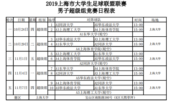 2019年上海市大学生足球联盟联赛男子超级组比赛于10月24在上海大学打响。本次比赛共有五支球队参赛,分别是木瓜视频
