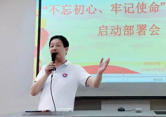 体育教学部党委书记季忠荣对主题教育开展动员,他指出体育教学部和国际足球学院全体党员同志要充分认识开展“不忘初心、牢记使命”主题教育的重大意义,把思想和行动统一到中央决策部署上来。他详细阐述了主题教育的总体要求、基本原则和着力重点。最后他结合体育教学部党委实际情况,提出这次主题教育活动始于2019年9月,于11月底基本结束。在此期间,主题教育要把学习教育、调查研究、整改落实贯穿全过程。并向巡回指导组报告了未来体育教学部党委的工作计划,他强调体育教学部和国际足球学院各党支部要坚持因地制宜、务实求效,把主题教育同推进“两学一做”学习教育常态化制度化结合起来,同推动所在单位的中心工作结合起来,防止“两张皮”。
