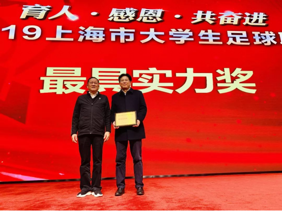 本次颁奖活动特别增设“最具实力奖”,该奖项评选根据2019年联赛各组别比赛成绩积分评定,同济大学凭借各组别队伍的共同努力,以总分第一的成绩荣获该奖项。上海市大学生体育协会会长薛明扬为我校颁奖,国际足球学院院长游松辉教授上台领奖并分享同济足球发展经验。