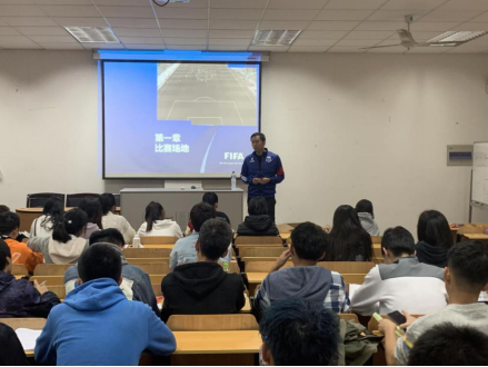 在第一天的培训中,同济大学国际足球学院杨璟勇老师为学员讲授足球竞赛规则发展史,上海市足球协会裁判技术讲师、上海理工大学体育教学部金俊老师作为特邀讲师为学员进行足球竞赛规则第1-5章的讲解。