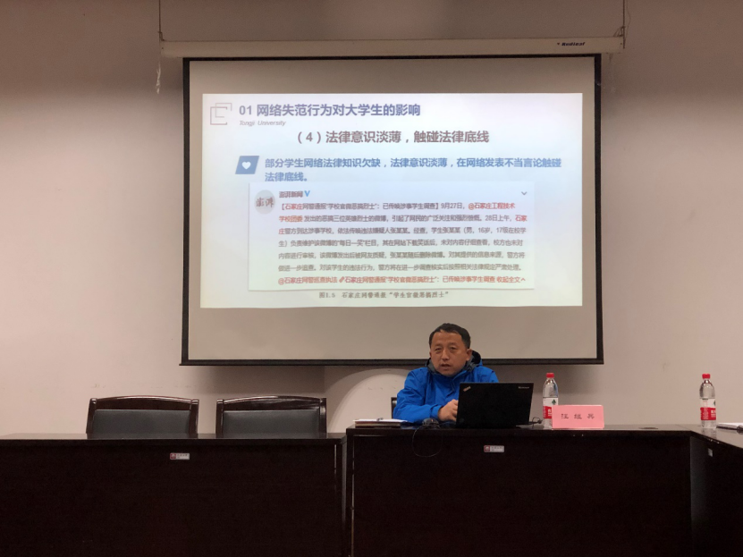 12月11日下午,同济大学国际足球学院研究生第一期高等讲堂在四平路校区南区体育馆一楼会议室举行。此次高等讲堂由国际足球学院副教授汪继兵老师担任主讲人,国际足球学院全体研究生及体育教学部部分同学参加。汪老师从网络失范行为对大学生的影响、网络行为相关要求及法规、大学生网络行为要求等多方面为2018级研究生带来一场深入浅出的网上行为规范教育。