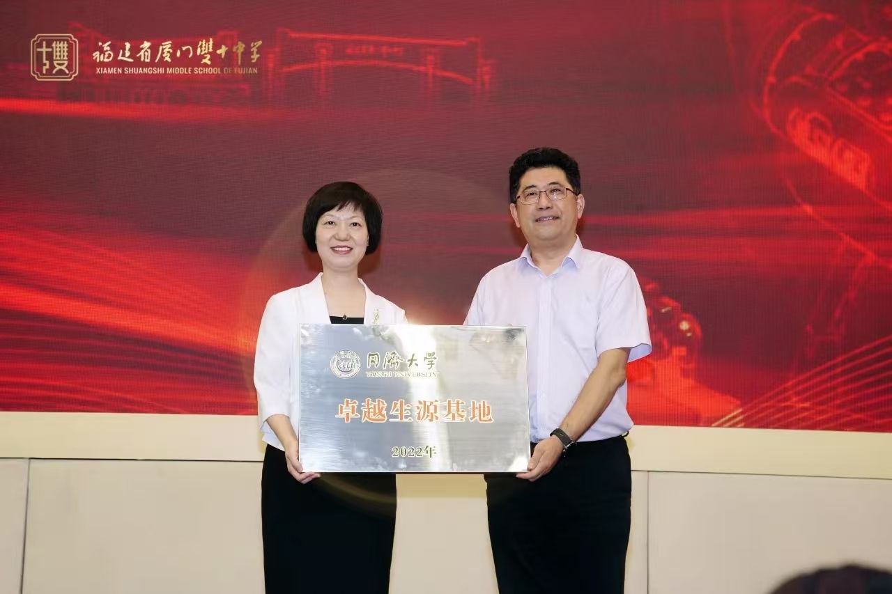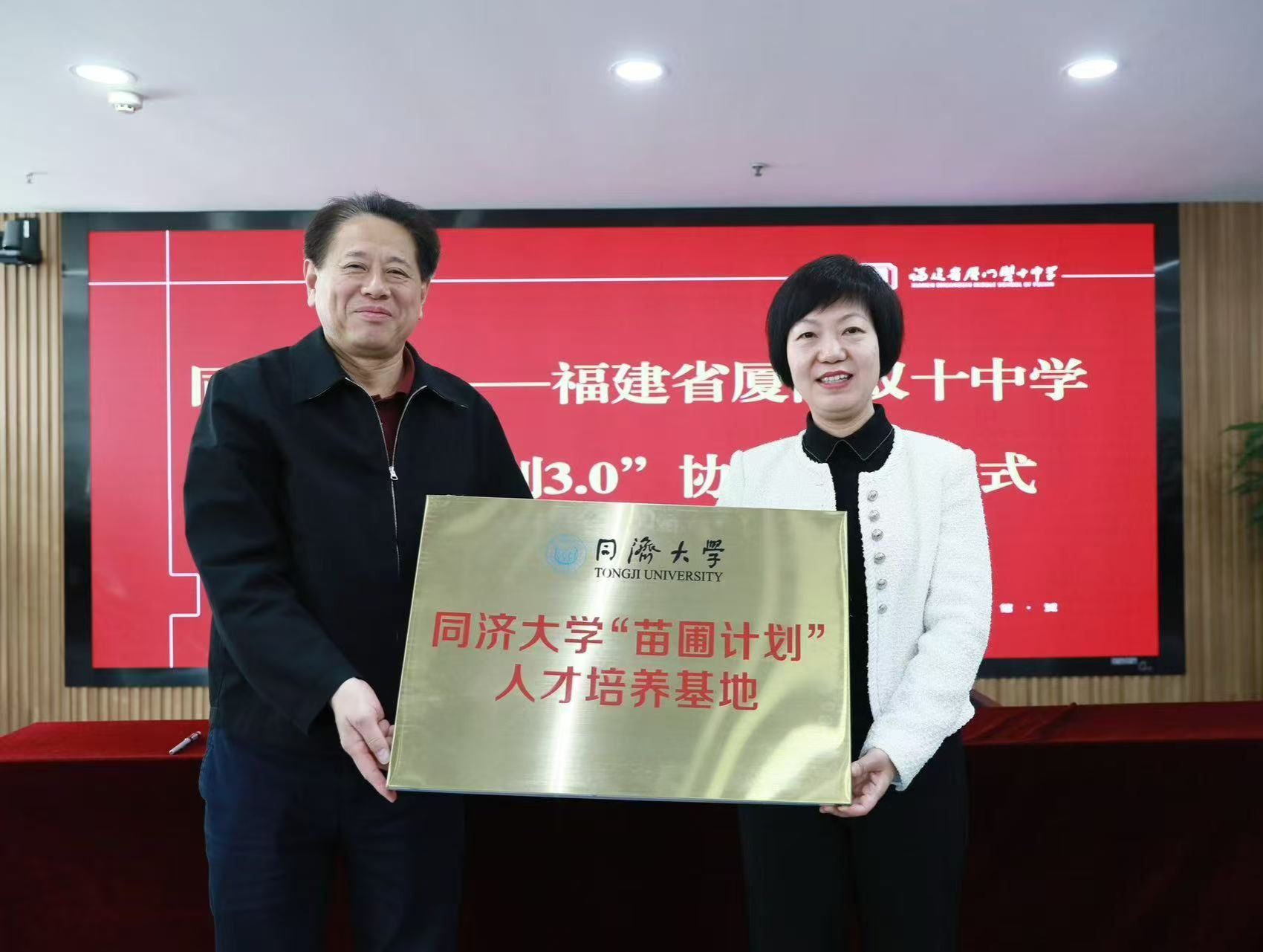 随后,同济大学福建招生组组长游松辉与福建省厦门双十中学校长黄强进行了“苗圃计划”人才培养基地签约仪式,并与福建省厦门双十中学党委书记欧阳玲共同为“苗圃计划”人才培养基地揭牌。