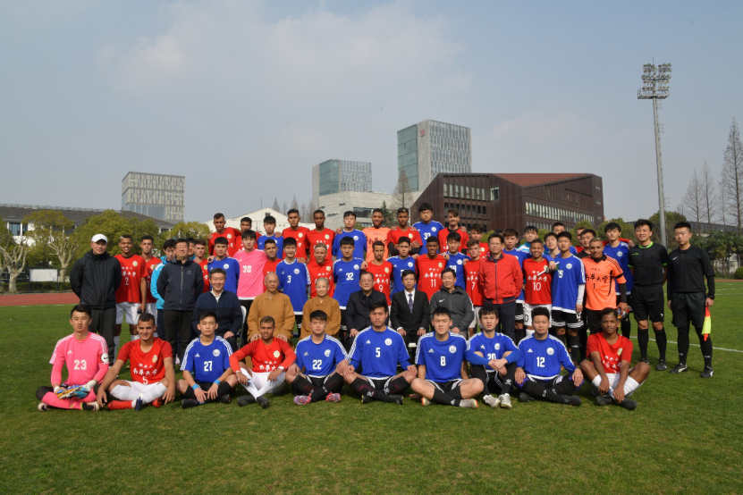 上海今天天气晴朗,温度适宜,给今天这个别开生面的交流活动增添许多暖意。南华大学足球队于上午10:00到达同济大学,随后在国际足球学院游松辉院长和相关老师的带领下来到队员休息室进行短暂的休息,然后参观了同济大学运动场和同济大学校史馆。经过中午短暂的休息,14:00,双方的运动员便来到一·二九运动场进行热身活动。14:45,在足球学院沈寅豪老师的主持下,入场仪式开始。雷星晖校长对台湾南华大学一行的到来表示热烈的欢迎,并以自己的故事勉励双方运动员,随后雷校长代表学校向对方赠送了学校纪念品。15:15,随着主裁判的一声哨响,比赛正式开始。双方没有经过太多的试探便直接开启了激烈的攻防。南华大学都是巴西籍队员,技术扎实、身体强壮。同济大学的小伙子灵动顽强、韧劲十足。虽然场面上占优,在门将范起业和后卫的统力协作下,确保城门不失。下半场第三十分钟左右,同济大学杨天斗反越位成功,机敏地抓住机会单刀直入将皮球捅进球门,为球队奠定了胜利。