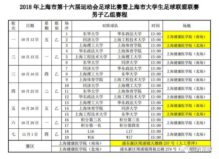 2018年上海市第十六届运动会足球比赛暨上海市大学生足球联盟联赛男子超级组第二轮在上海健康医学院北球场展开。同济大学足球队以0:1惜败东华大学队。