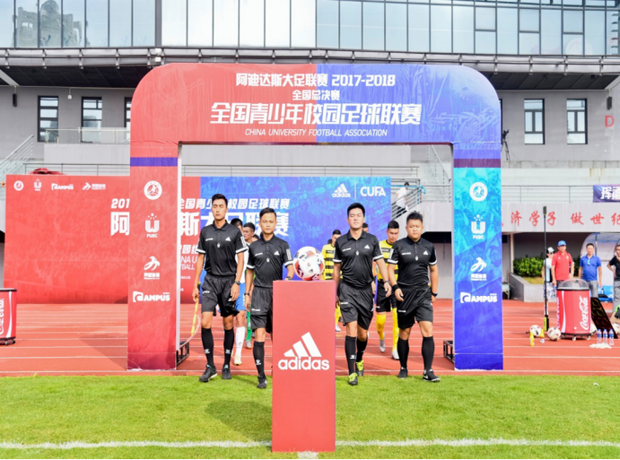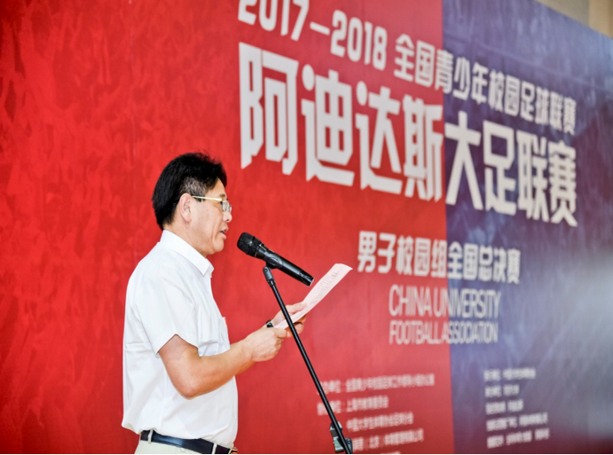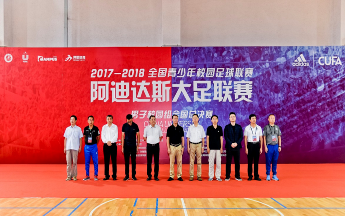 2018年7月24日8点,2018阿迪达斯大足联赛校园组全国总决赛在同济大学129运动馆正式拉开大幕。同济大学副校长雷星晖致欢迎辞,同济大学校务委员会副主任、中国大学生体育协会足球分会主席姜富明教授,为校园组全国总决赛揭幕,开幕式由同济大学国际足球学院院长、中国大学生体育协会足球分会秘书长游松辉主持。中国大学生体育协会常务理事、中国大学生体育协会副主席华爱军先生,同济大学校务委员会副主任、中国大学生体育协会足球分会主席姜富明教授,同济大学副校长雷星晖教授,中国大学生体育协会校园足球工作部副主任赵俊杰先生,上海市教育委员会体委艺科处黄峰先生,阿里体育副总裁魏全民先生,巴西桑托斯俱乐部特约嘉宾方泽先生,