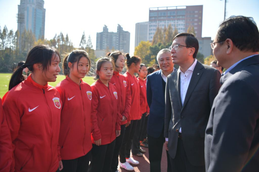 再过几日,双方合作共建的上海海港同济大学女子足球队即将首次出征中国足球协会女子乙级联赛。签约仪式结束后,顾金山、方守恩、严俊、陈杰等来到同济大学一·二九运动场,出席上海海港同济大学女子足球队出征仪式,向24名女足队员们表示亲切慰问,希望她们赛出风格、赛出水平,充分展现上港集团和同济大学的精神风貌。顾金山、方守恩互赠球衣。严俊、陈杰分别为女足队员们授旗。